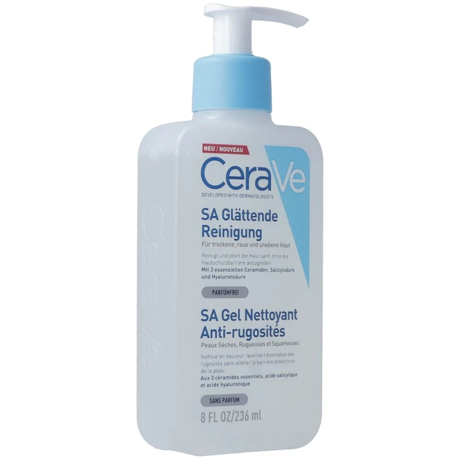 CERAVE SA Smoothing Cleansing Disp 236 ml Washing lotion for dry and rough facial and body skin. Contents AQUA / WATER, SODIUM LAUROYL SARCOSINATE, COCAMIDOPROPYL HYDROXYSULTAINE, GLYCERIN, NIACINAMIDE, GLUCONOLACTONE, SODIUM METHYL COCOYL TAURATE, PEG-150 PENTAERYTHRITYL TETRASTEARATE, CERAMIDE NP, CERAMIDE AP, CERAMIDE EOP, CARBOMER, CALCIUM GLUCONATE, SALICYLIC ACID, SODIUM BENZOATE, SODIUM LAUROYL LACTYLATE, CHOLESTEROL, PHENOXYETHANOL, DISODIUM EDTA, TETRASODIUM EDTA, HYDROLYZED HYALURONIC ACID, PHYTOSPHINGOSINE, XANTHAN GUM, ETHYLHEXYL GLYCERIN