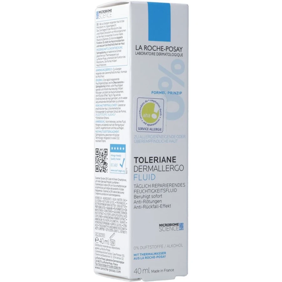 ROCHE POSAY Toleriane Dermallergo Fluid AHA 40 ml TOLERIANE Dermallergo Fluid is a daily moisturizer for hypersensitive or allergy-prone skin. The unique formula moisturizes, soothes irritated skin, reduces redness and strengthens the skin protective barrier. Tested on allergic skin. Hypoallergenic formula. Fragrance-free, alcohol-free. Ultra-hermetic pump dispenser for optimal protection the formula.