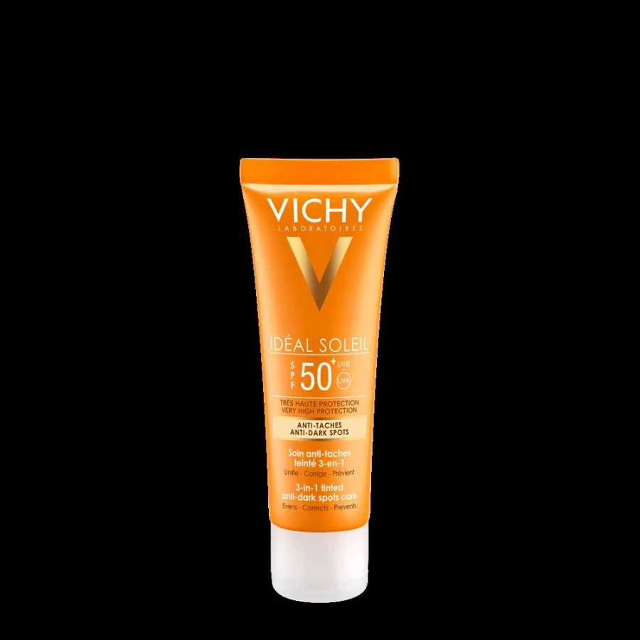 VICHY IS Anti-Pigment Spot Cream 3in1 tinted SPF50+ 50 ml THE 1st ALL-OVER ANTI-PIGMENT SPOT CREAM WITH 3-IN-1 EFFECT. Effect * Balances for an immediately even complexion * Universal Mineral Pigments: Corrects dark spots day after day * Phe-Resorcinol 0.3%: Prevent new appearance of pigment spots * SPF 50+ – UVB / UVA Tinted, dry, non-greasy finish that works day after day ensures even and radiant skin. For use on the face and décolleté. Application Apply and reapply the product before going out in the sun regularly after swimming or sweating. Save those eye contour. If your eyes have come into contact with the product, rinse immediately and thoroughly. Also avoid contact with of clothing.